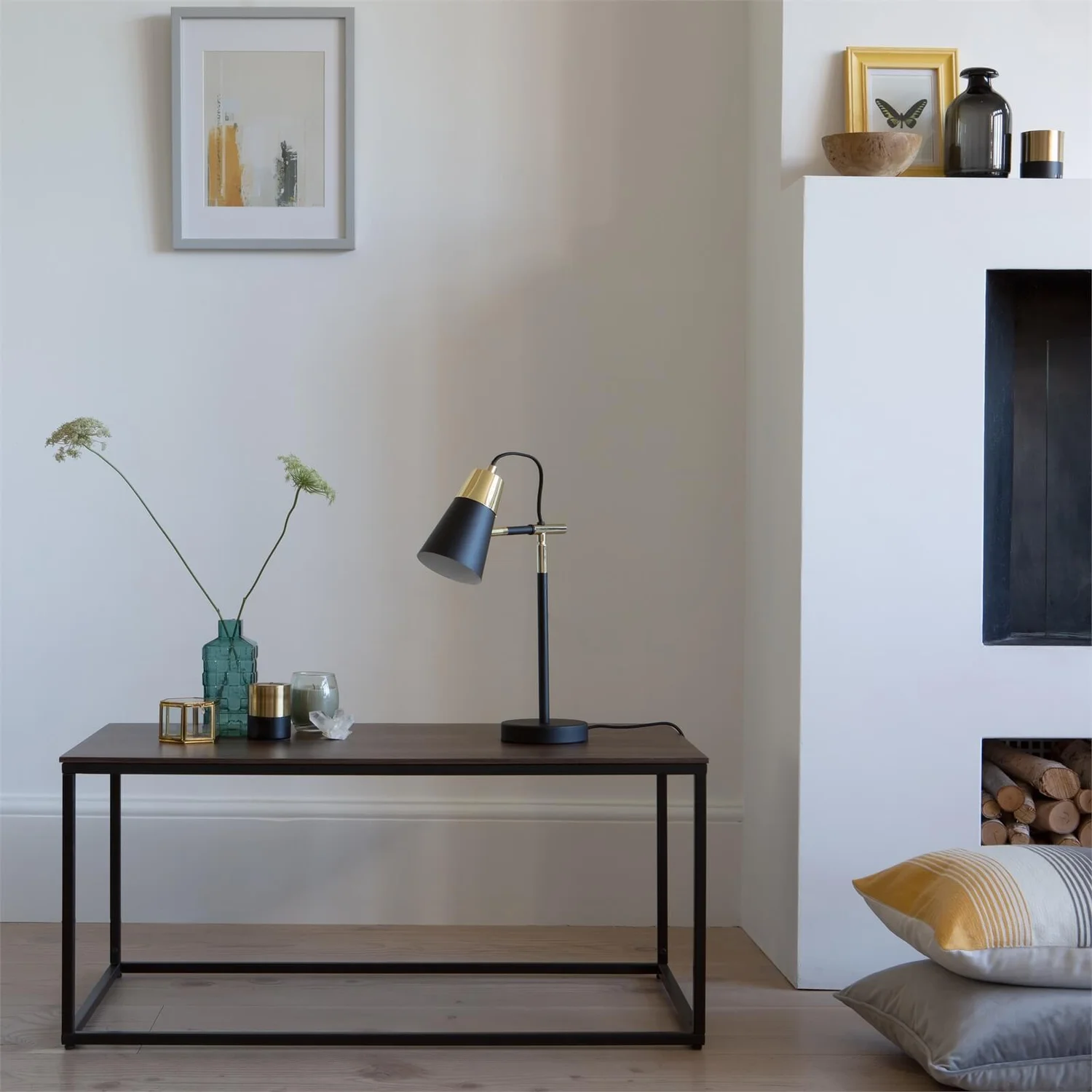 A stylish desk lamp in matt black with gold trim, which would sit easily in both modern and traditional decor schemes.